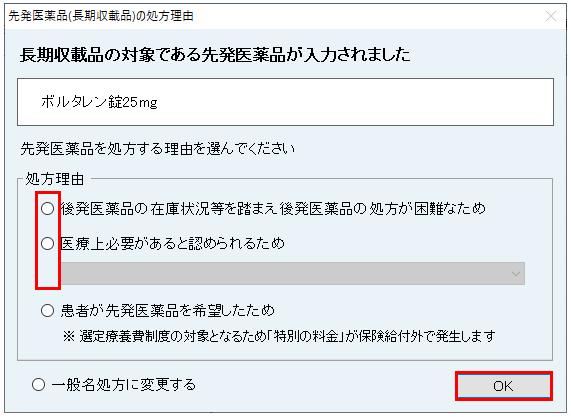 - 入力した医薬品が長期収載品である場合は「先発医薬品(長期収載品)の処方理由」画面を表示しますので、該当する「処方理由」を選択し[OK]をクリックします。